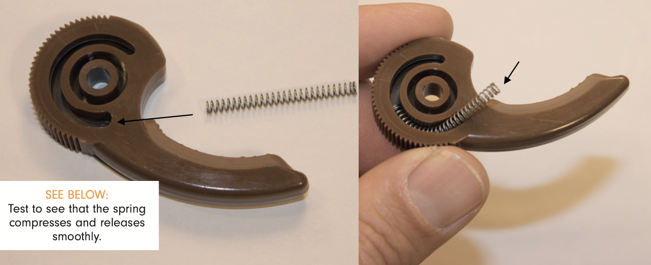 Insert the Compression Spring into larger end of slot using a gentle, arcing motion while pushing / turning.